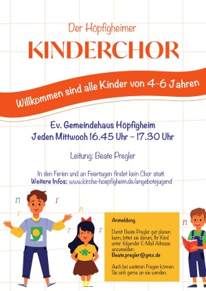 Beim Kinderchor sind alle Kinder von 4 – 6 Jahren willkommen. Wir treffen uns jeden Mittwoch von 16:45 Uhr – 17:30 Uhr im Ev. Gemeindehaus Höpfigheim.