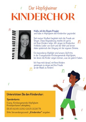 Unter der Leitung von Beate Pregler singen wir im Kinderchor fröhliche Lieder von Gott und der Welt und lernen dabei spielerisch den Umgang mit der eigenen Stimme. Ein besonderes Highlight sind unsere Auftritte in der Evangelischen Kirchengemeinde Höpfigheim, bei denen die Kinder zeigen können, was sie gelernt haben.
