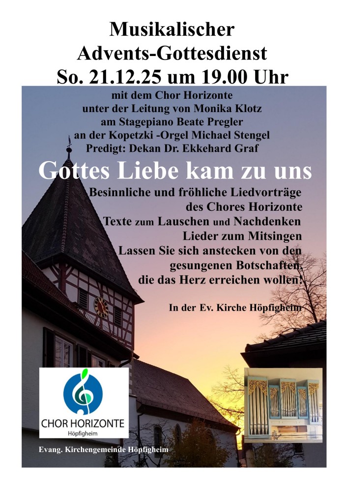 4. Advent – Musikalischer Advents-Gottesdienst – Gottes Liebe kam zu uns – mit Dekan Dr. Ekkehard Graf, dem Chor Horizonte, Organist Michael Stengel